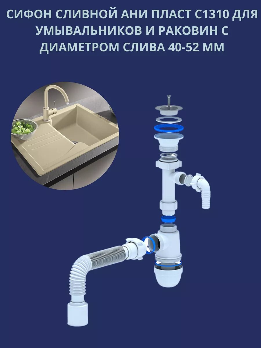 Сифон для кухонной мойки АНИ пласт A2010, 1 1/2"х40 с литым выпуском, отводом для бытовой техники, с гибкой трубой 40/50 мм
