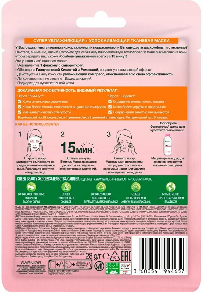 Маска тканевая для лица GARNIER Увлажнение + Комфорт с гиалуроновой, П-Анисовой кислотами, экстрактом ромашки, для сухой кожи, 32г информация: