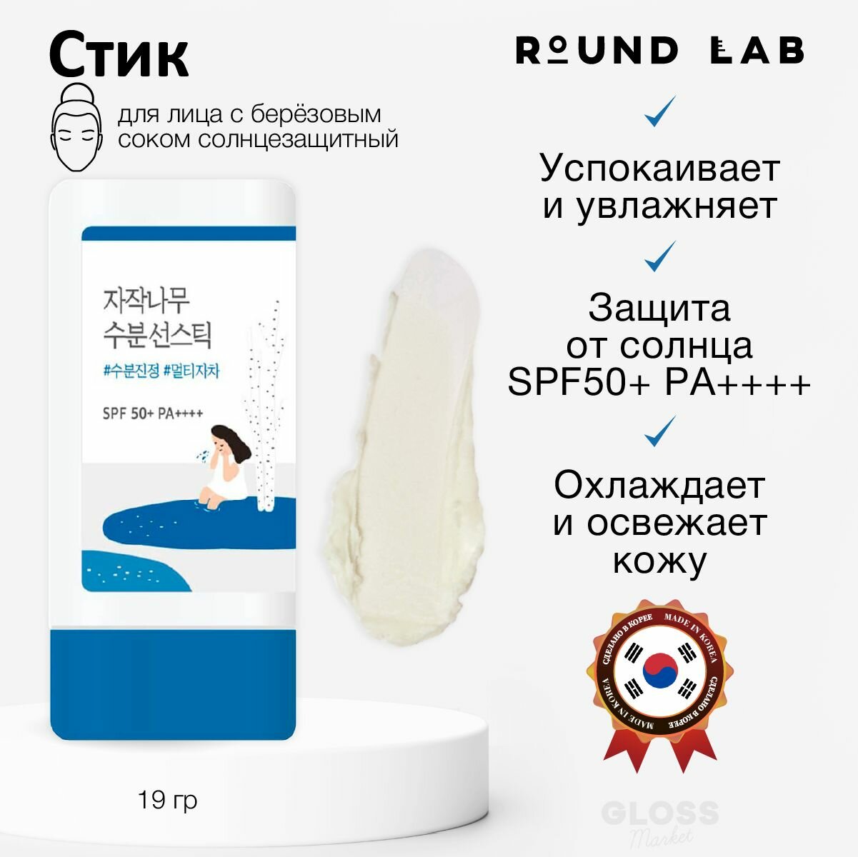 Стик Round Lab Солнцезащитный стик c берёзовым соком и гиалуроновой кислотой / SPF50 Birch Juice Moisturizing Sun Stick 19 гр. информация: