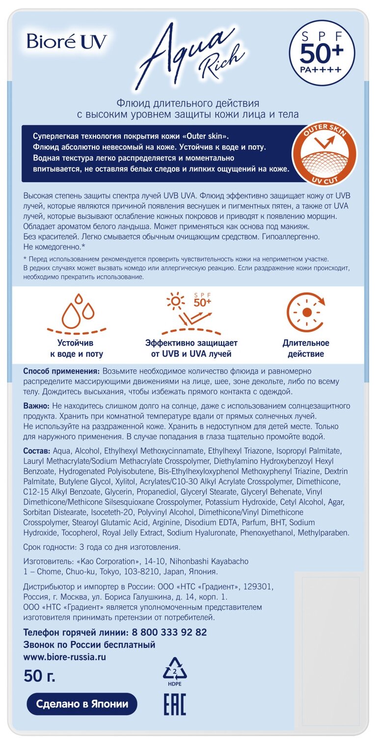 BIORE UV Aqua Rich Солнцезащитный флюид SPF50 50 гр информация: