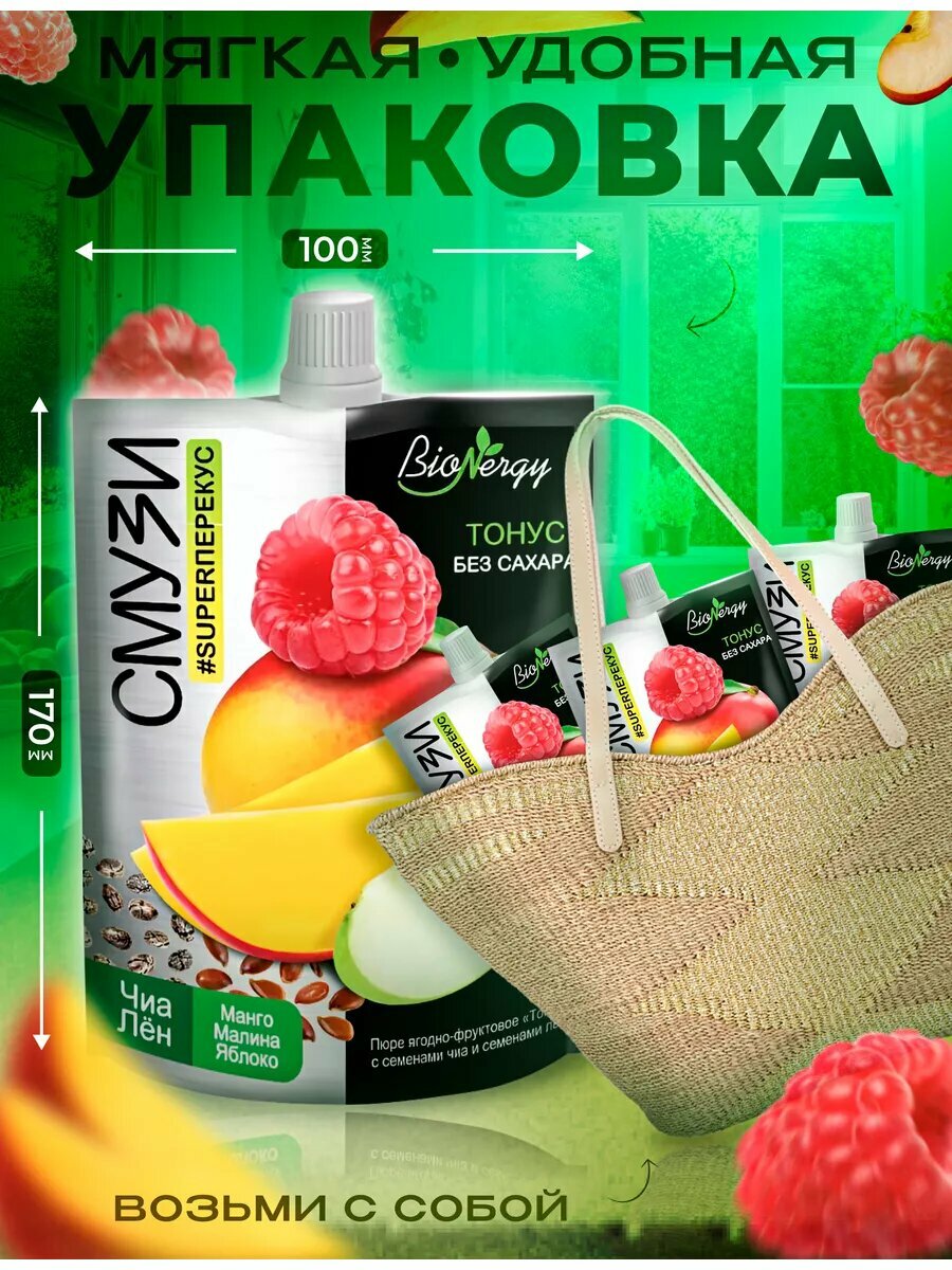 Смузи Тонус без сахара Чиа, лен (манго, малина, яблоко) BioNergy, 10 шт по 120 г