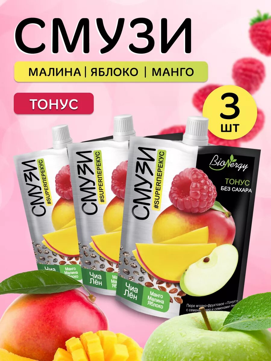 Смузи Тонус без сахара Чиа, лен (манго, малина, яблоко) BioNergy, 3 шт по 120 гр 518 ₽