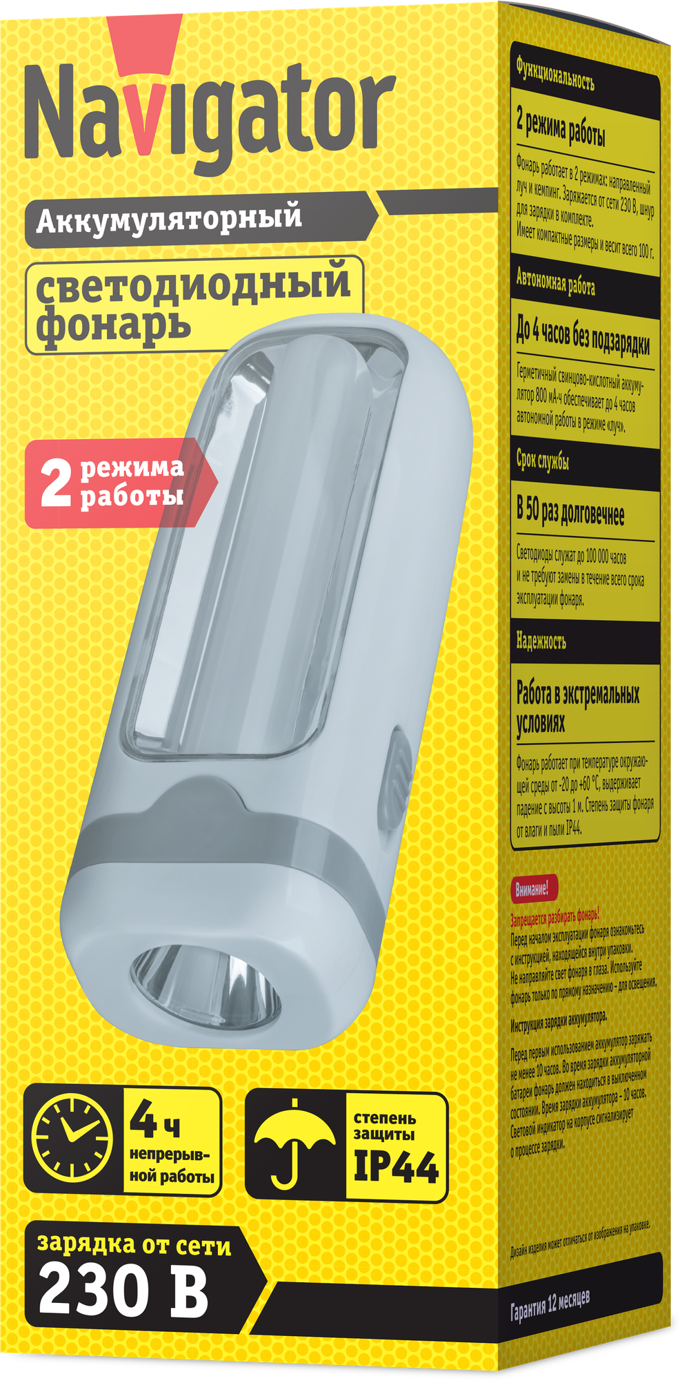 Фонарь ручной Navigator NPT светодиодный 11 LED 3/2 Вт аккумуляторный Lead-acid 800 мАч ударопрочный пластик 2 режима (14028) информация: