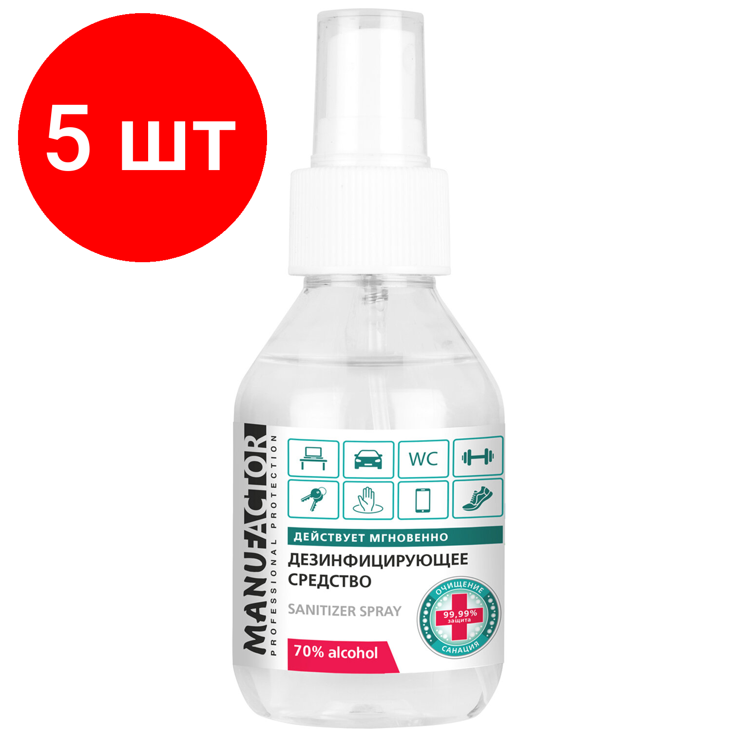 Антисептик для рук и поверхностей спиртосодержащий (70%) с распылителем 100 мл MANUFACTOR дезинфицирующий жидкость, 5 шт информация: