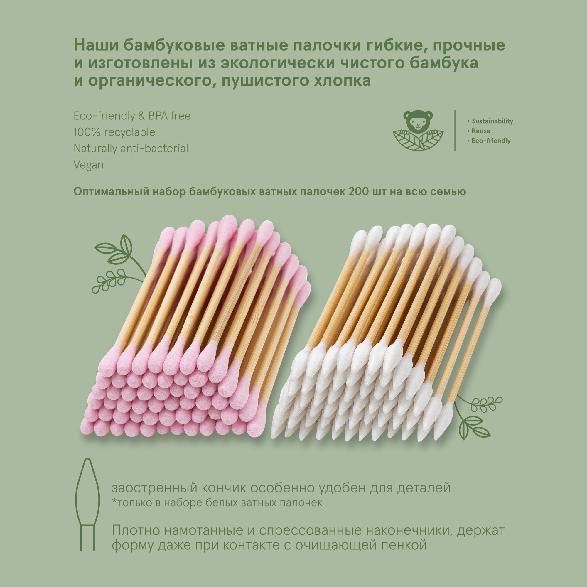 Бамбуковые ватные палочки с органическим хлопком розовые и белые 200 шт. информация: