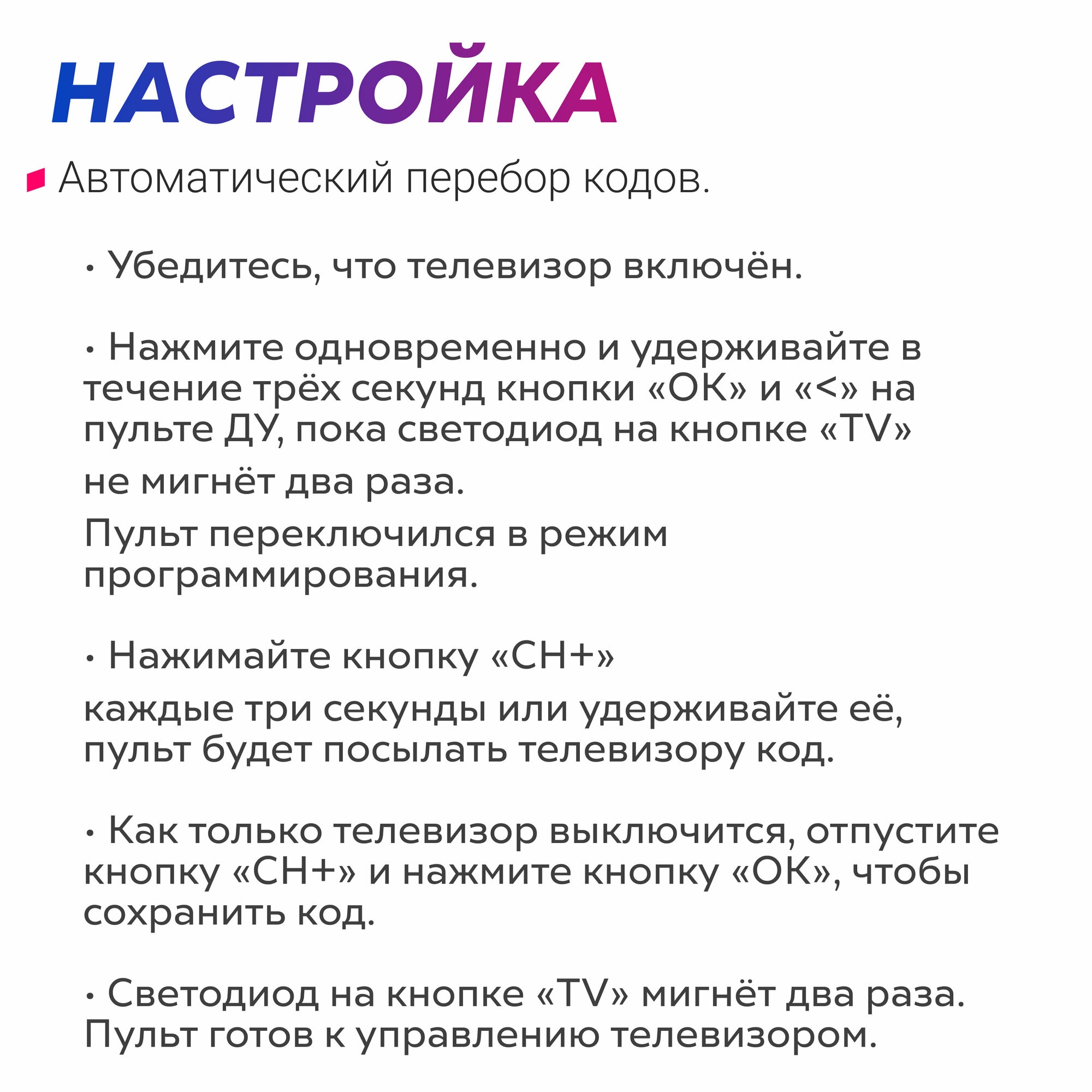 | Настройка пульта ДУ | автоподбор кода / ввод кода |