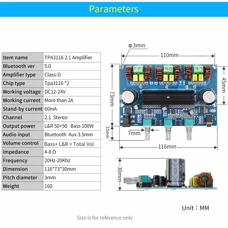 Аудио усилитель мощности UNISIAN Bluetooth 5,0 2X50W + 100W Bass TPA3116D2 HIFI Digital 2,1 Chennels информация: