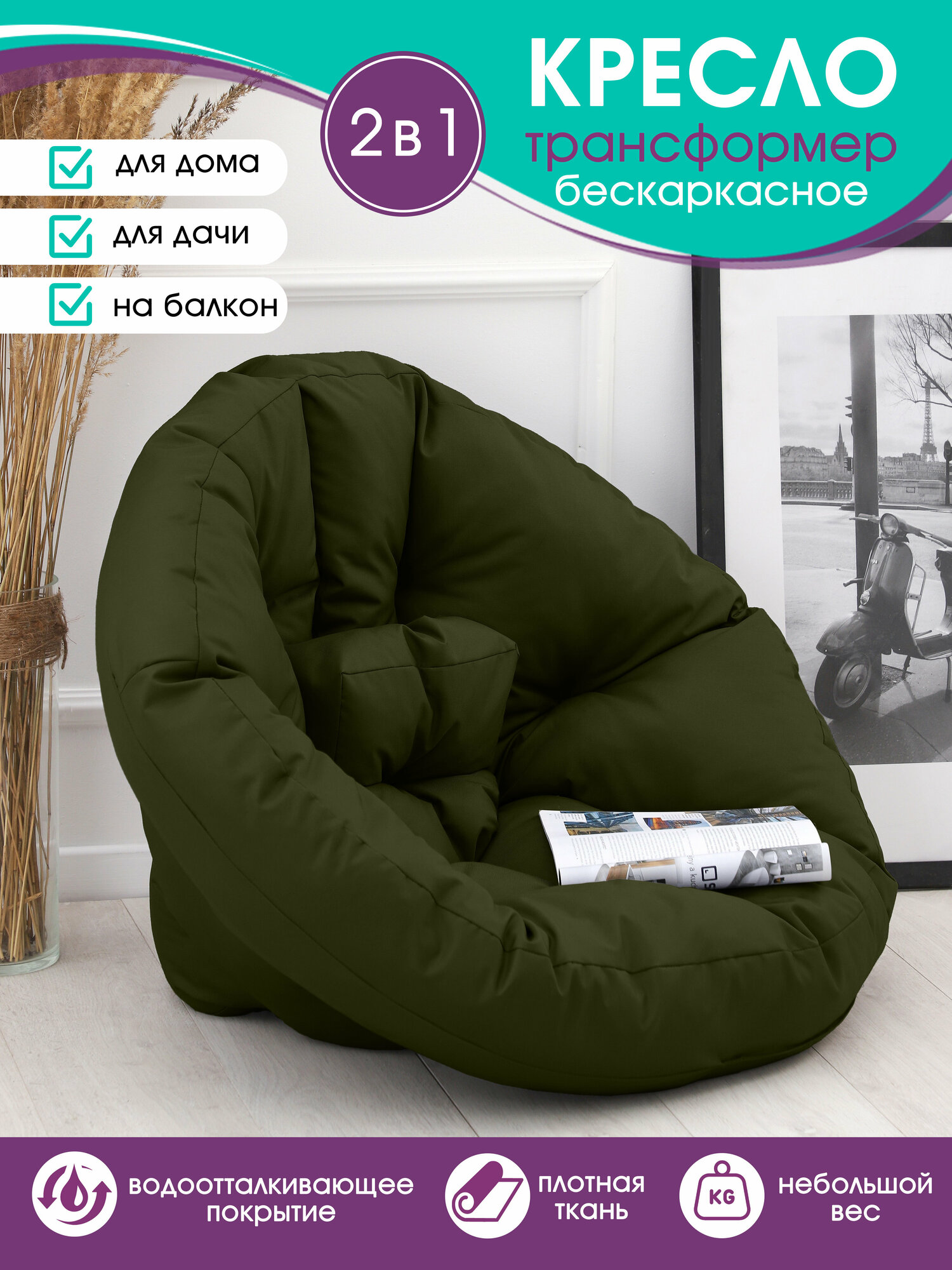 Кресло мешок , бескаркасное кресло, пуфик мешок, футон трансформер, Bio-Line , прочный, водонепроницаемый, хаки 4 270 ₽