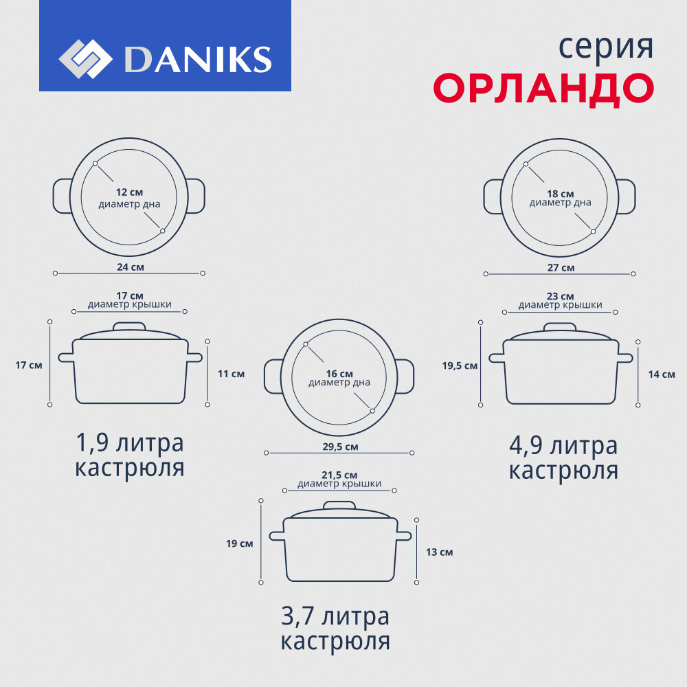 Набор посуды Daniks из нержавеющей стали, 12 предметов, кастрюли 1.9,2.9,3.9,6,5л, ковш 1.9 л, сковорода 24см