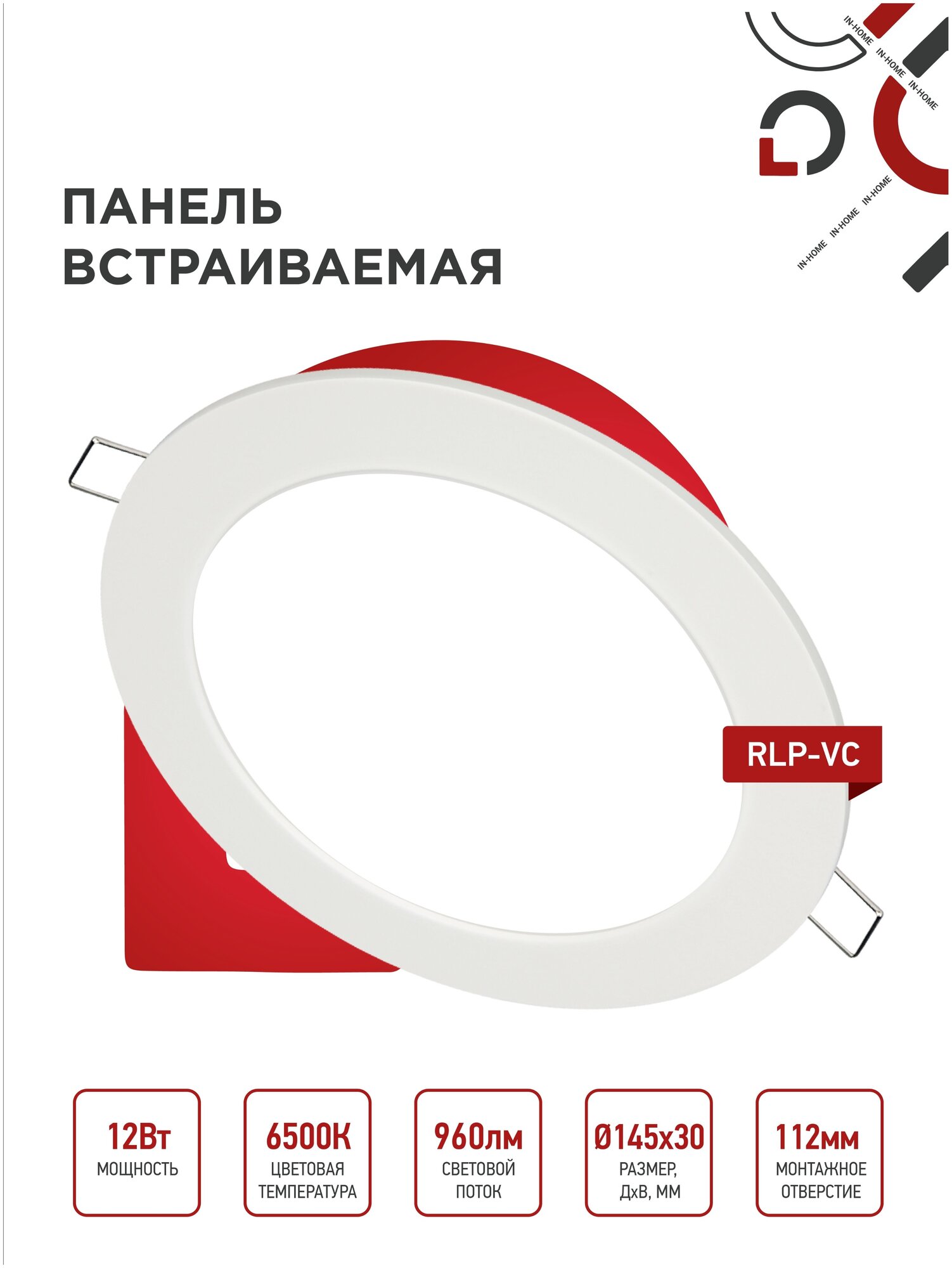 | Дополнительная информация | Светильник встраиваемый In Home RLP-VC 12Вт 230В 4000К 960Лм IP40 145мм белый |