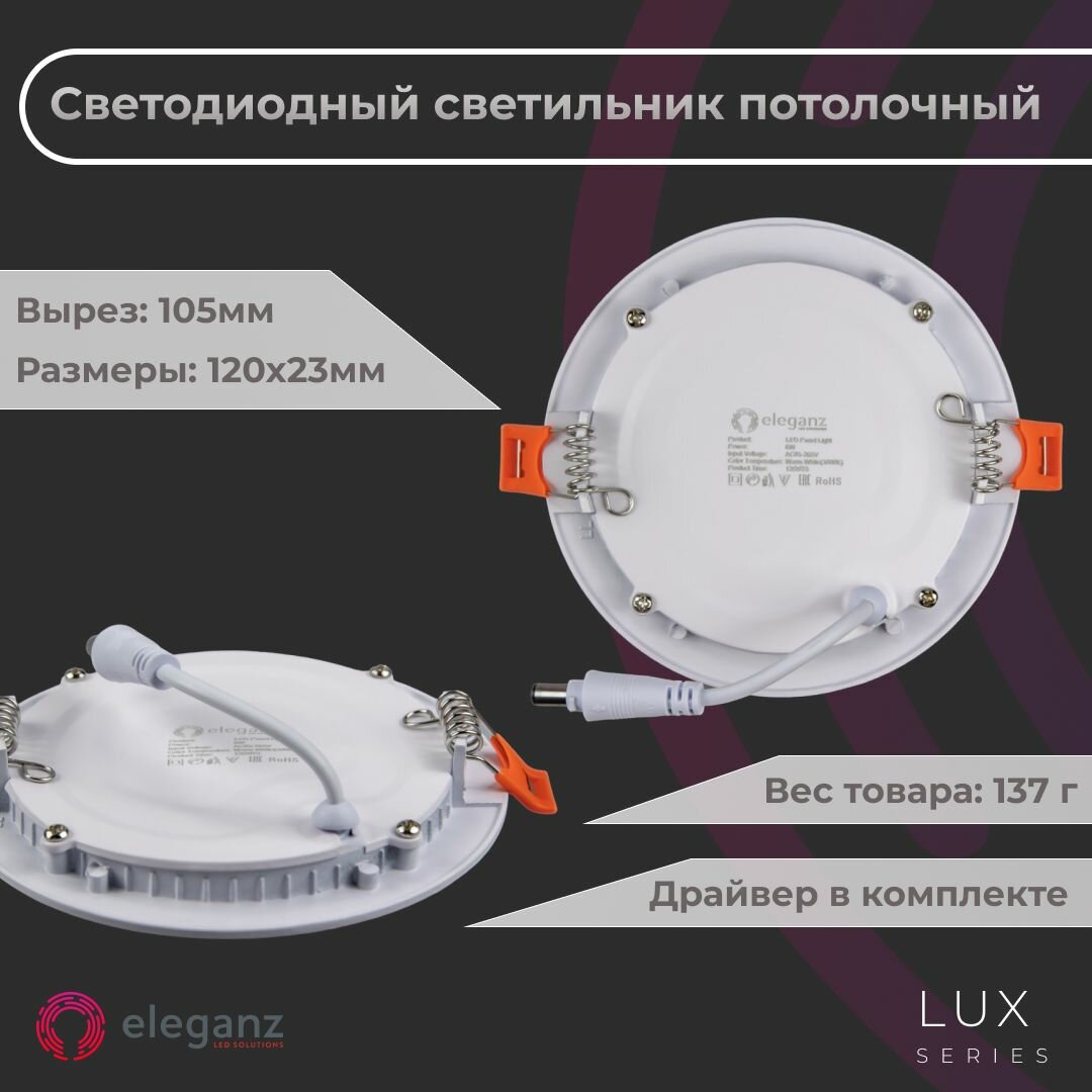 Встраиваемый светильник "Eleganz" 6Вт Круг 6000К Светодиодная алюминиевая панель от сети 220 В, белый корпус информация: