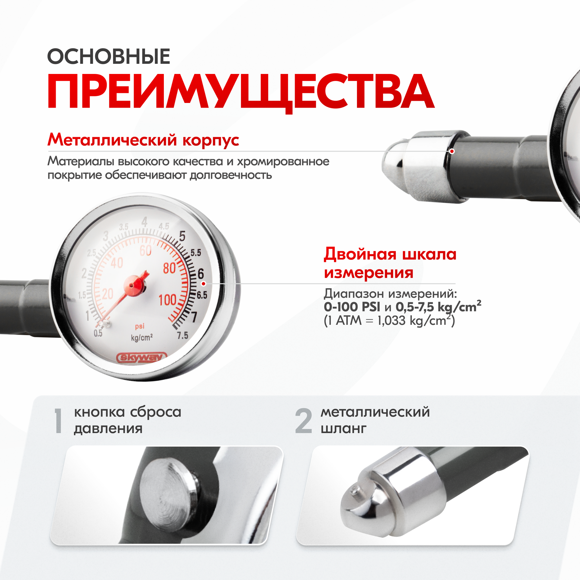 Манометр Skyway в метал. корпусе 7,5 АТМ в пластиковом футляре информация: