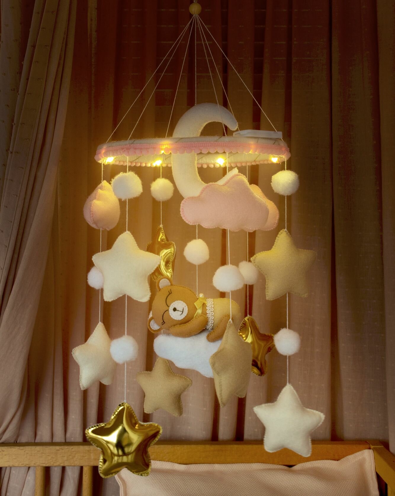 Мобиль на кроватку музыкальный для новорожденных и кронштейн из дерева-3