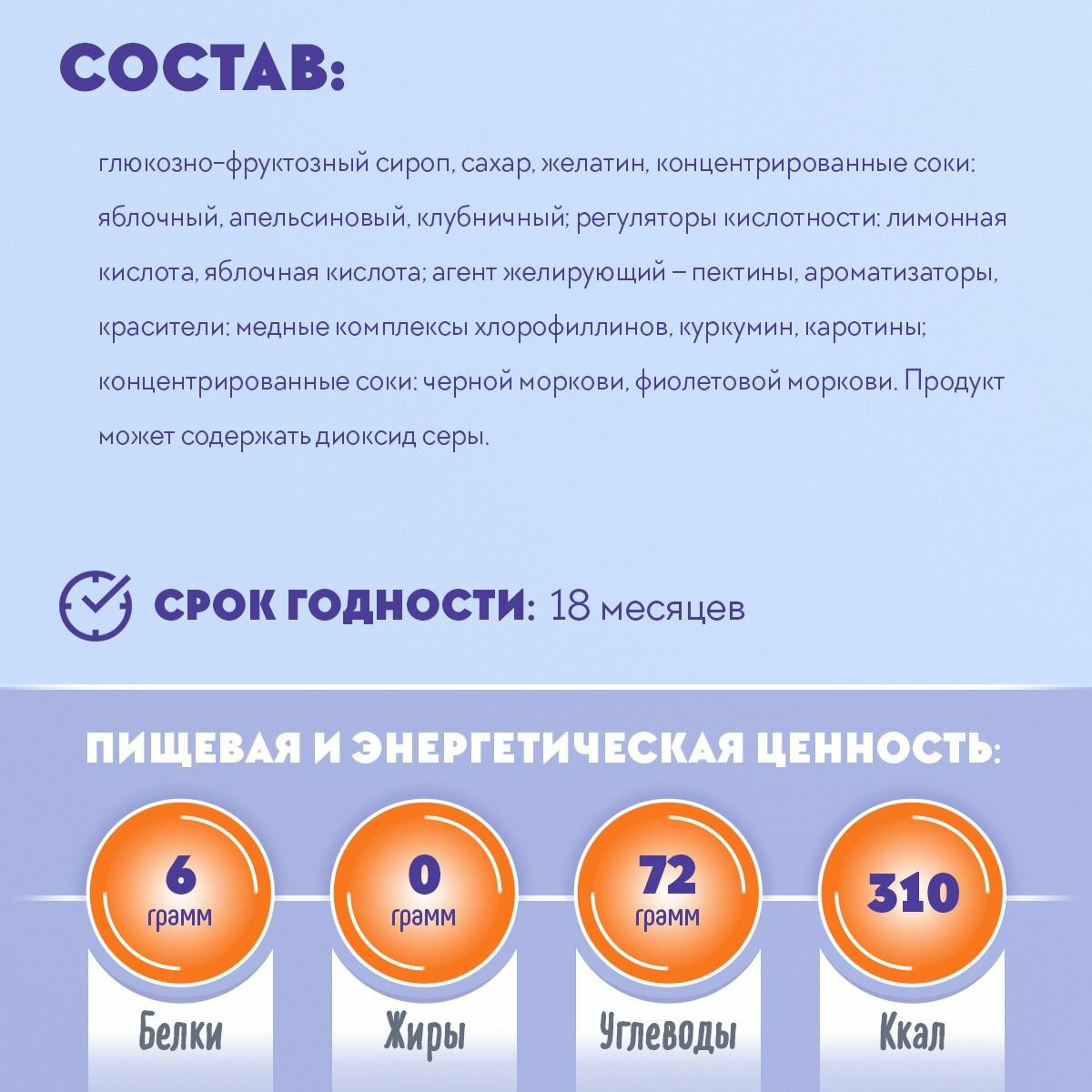 | Состав | желатин, сахар, глюкозно-фруктозный сироп |