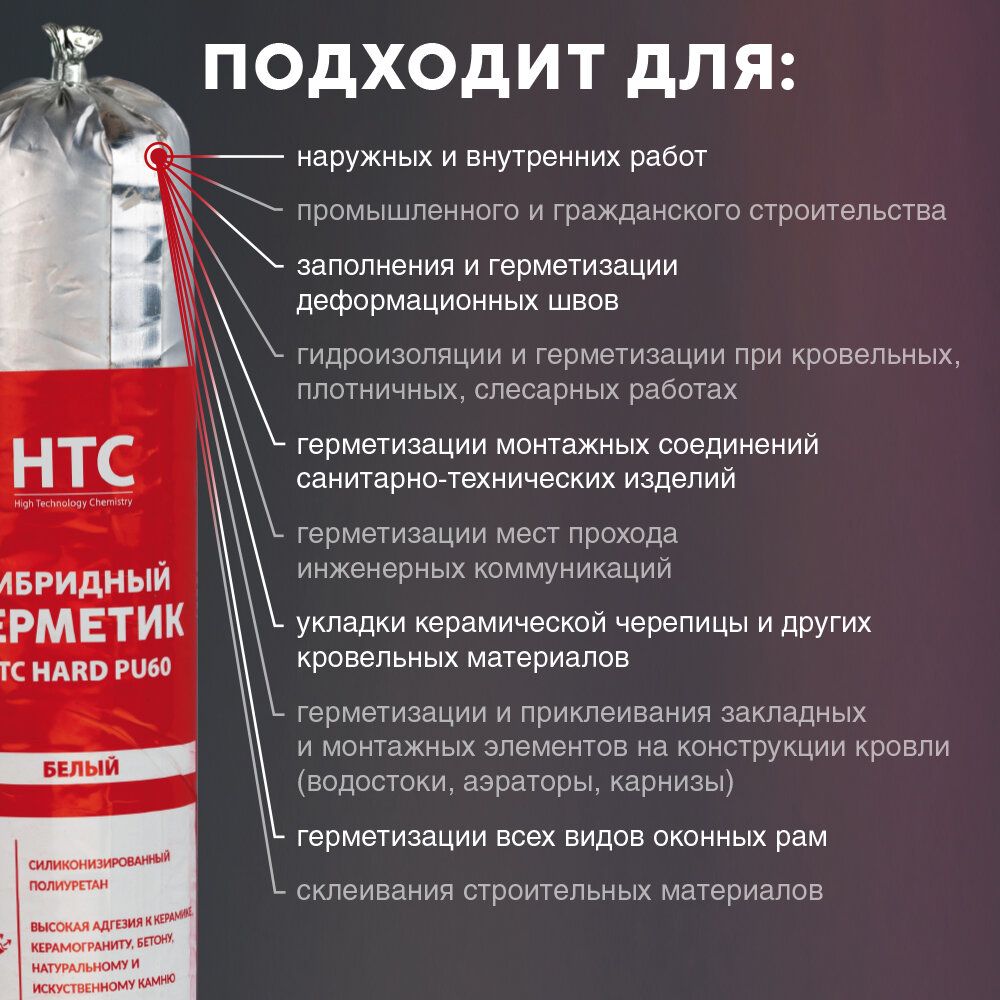 | Подробная комплектация | Герметик гибридный HTC Hard PU60 600 мл белый |