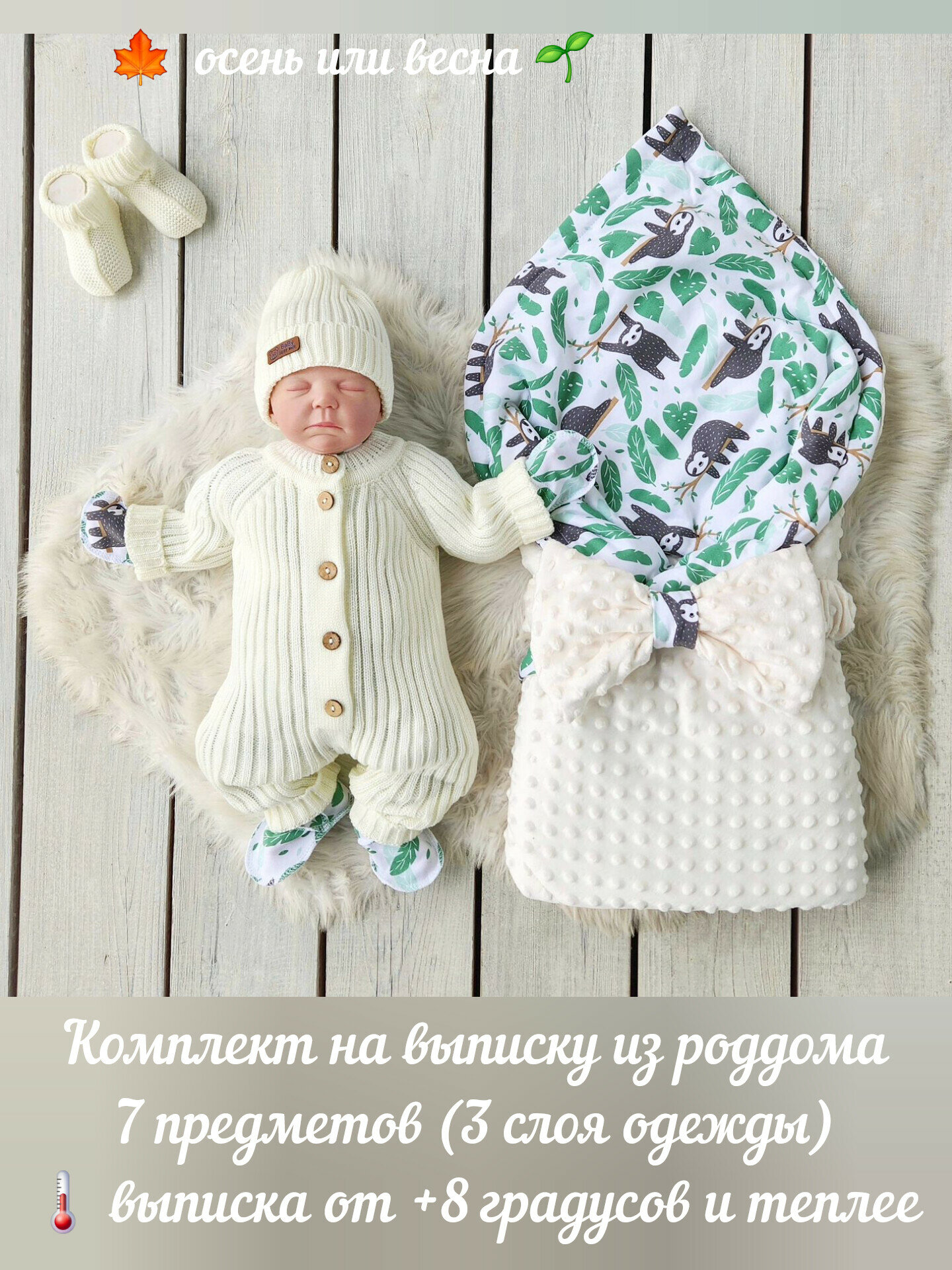 Комплект на выписку из роддома, 7 предметов, размер 56-62, ленивцы информация: