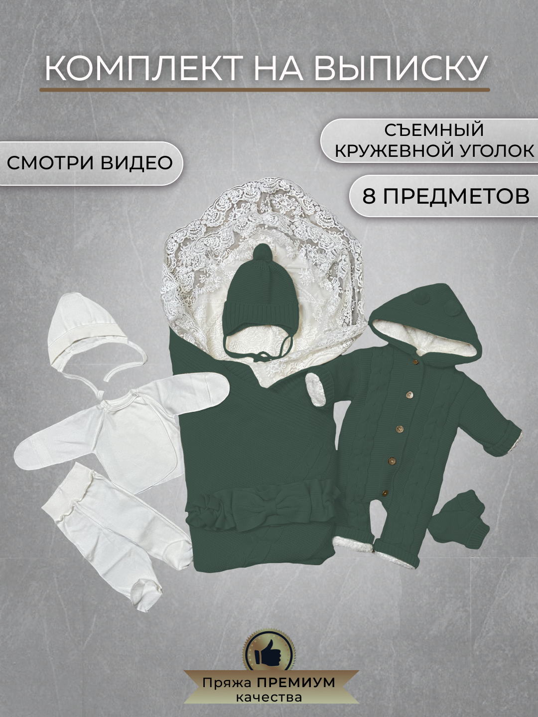 Отзывы на Конверт для новорожденного комплект вязаный 8 предметов на выписку вязаный В роддом подарочный зеленый
