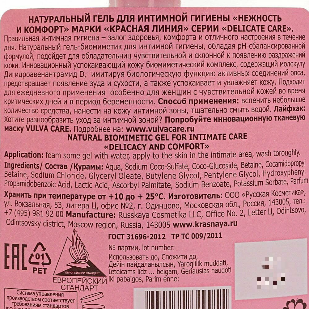 Гель Красная линия для интимной гигиены Нежность и комфорт 300 мл информация: