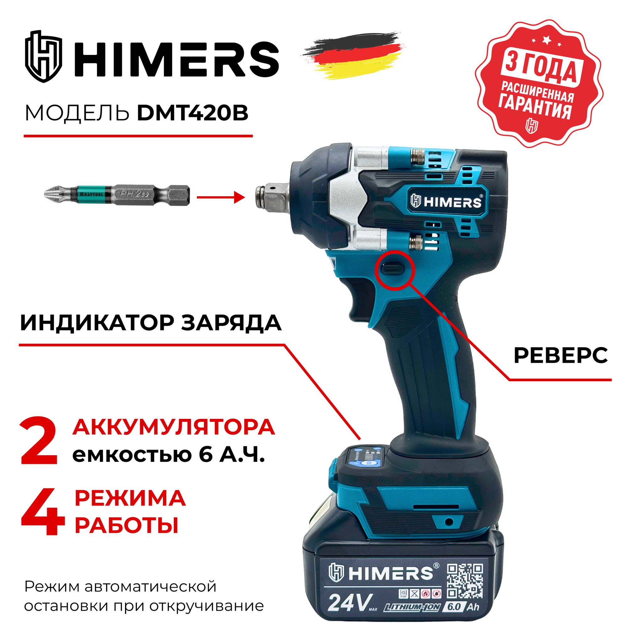 420 Н.М. Ударный бесщеточный гайковерт HIMERS DMT420B аккумуляторный 24V, 2 АКБ по 6 А.ч., 420 Н.м., / Кейс / для закручивания, 24в, квадрат 1/2 информация: