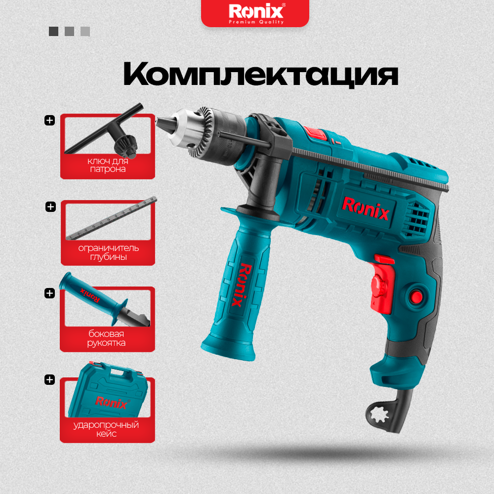 Ударная сетевая дрель Ronix мощностью 750Вт ключевой патрон, функция реверса, регулировка глубины сверления, дополнительная рукоять информация: