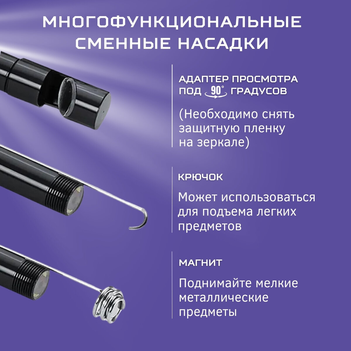| Комплектация | Видеоэндоскоп 1шт, кабель Micrо-USB / USB / TYPE-C 1шт, переходник 1 шт, насадки 3 шт |