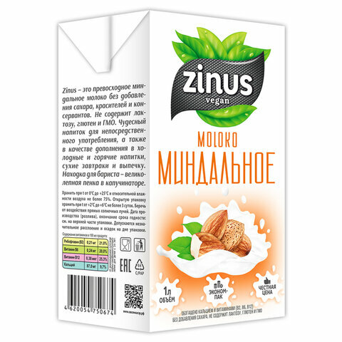 10 цен на Молоко миндальное от бренда "ZINUS", растительный напиток, 1 л
