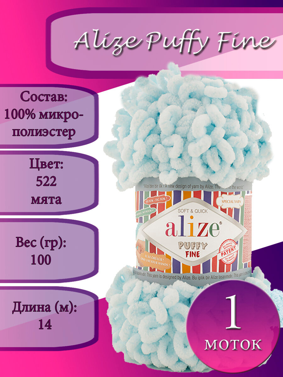 Пряжа Alize Puffy fine светлая бирюза (522), 100%микрополиэстер, 14.5м, 100г, 1шт информация:
