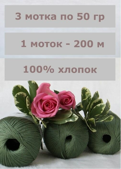 Пряжа Камтекс "Хлопок мерсеризованный", цвет: 294 - Хаки, 3 шт., хлопок 100%, 50 г. 200 м. информация: