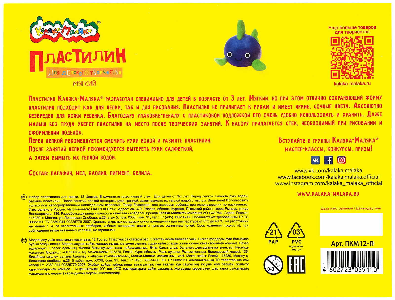 Пластилин повышенной мягкости Каляка-Маляка 12 цветов, 180 г, со стеком, 1 упаковка информация: