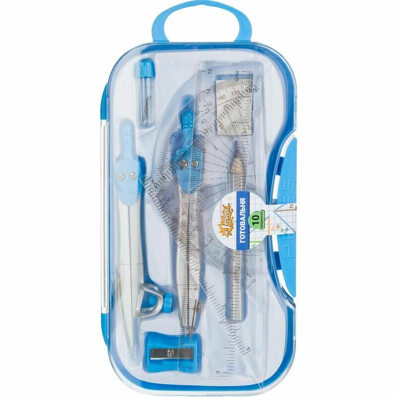 | Комплектация | Циркуль — 2 шт. Запасной грифель Линейка — 1 шт. Треугольник — 2 шт. Транспортир — 1 шт. Карандаш — 1 шт. Точилка — 1 шт. Ластик — 1 шт. |