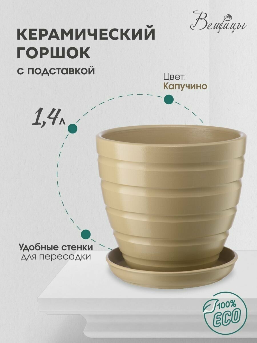 Керамический горшок цветочный ВеЩицы с подставкой блюдцем / Горшок для цветов с поддоном / Горшок для растений / объем 1,4 л, цвет капучино