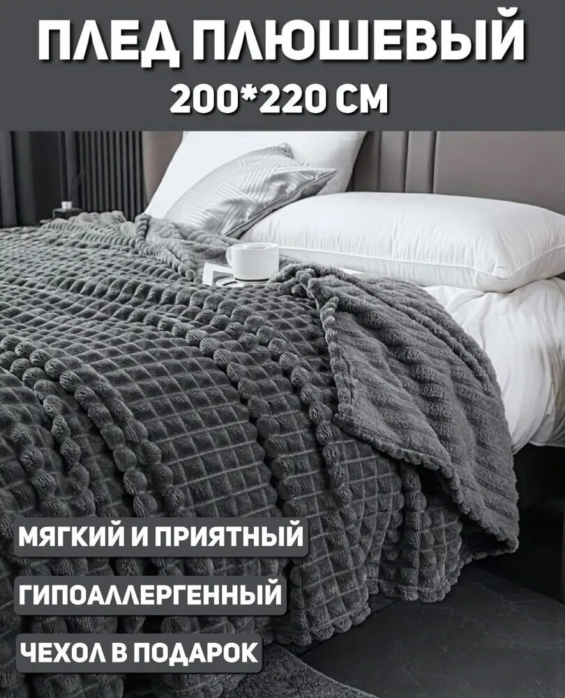 Отзывы на Плед 200х220, Покрывало на кровать, темно-серый, Велсофт, Пушистый плед на диван, Накидка