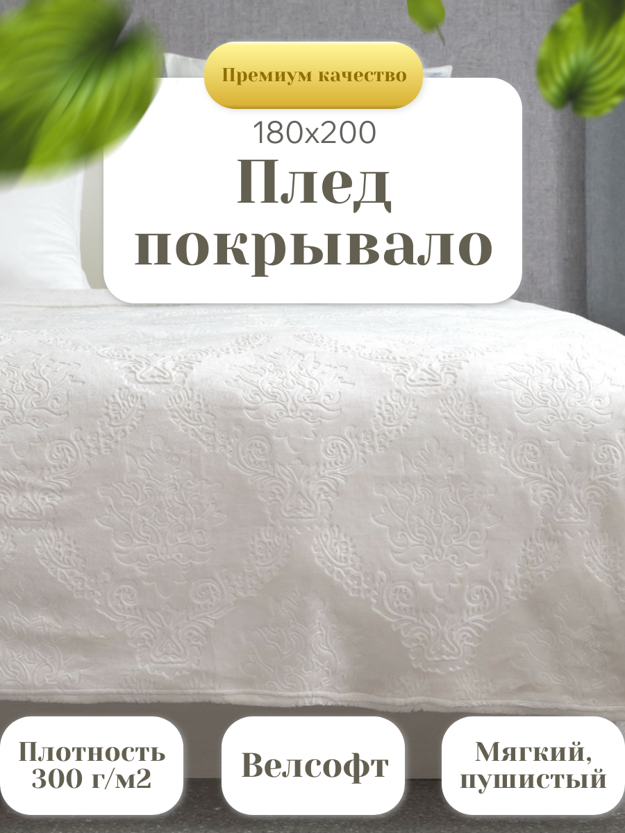Плед на диван "Вензель" 180x200, молочный, состав - велсофт 1 099 ₽