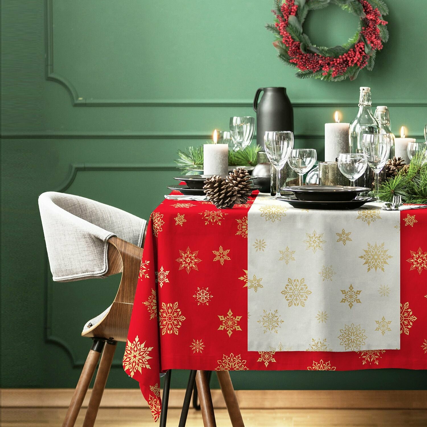 Комплект скатерть 145х180 + дорожка 50х145 "Унисон" рис 33280-2/33280-3 White snowflakes белый/красный 1 115 ₽