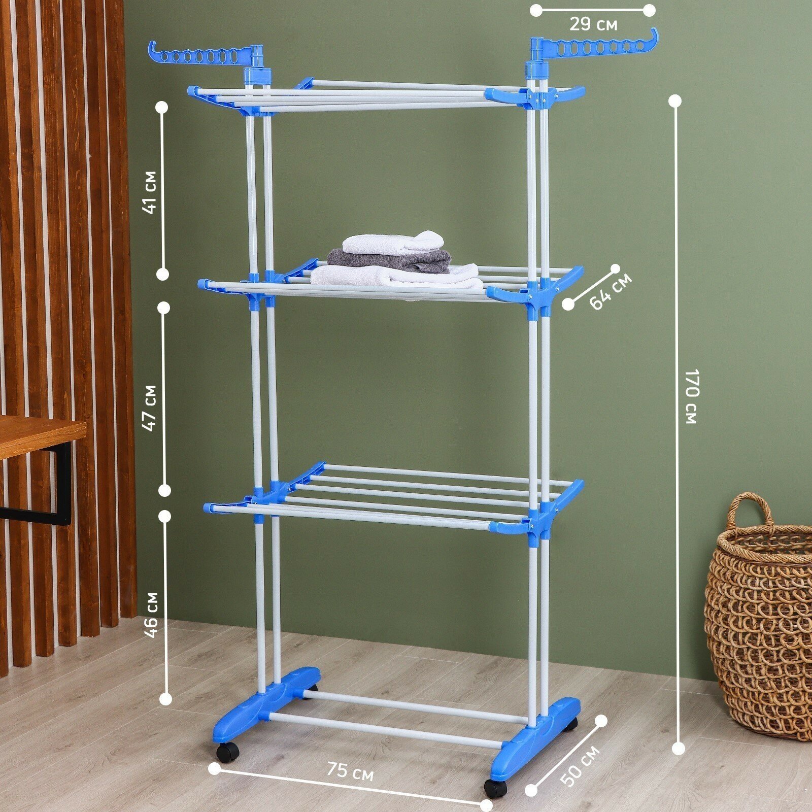 10 цен на Сушилка для белья напольная, 3-х уровневая Доляна, 75(126)×64×170 см, рабочая длина 16 м, на колёсах, металлическая