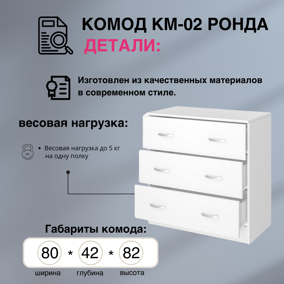 Комод Ронда КМ-02, Белое дерево, ЛДСП, с ящиками, для прихожей, спальни, гостиной, 800х820х420, интерьер-цент 4 600 ₽
