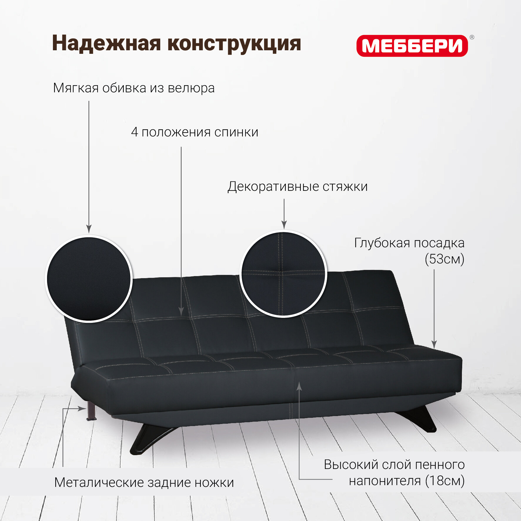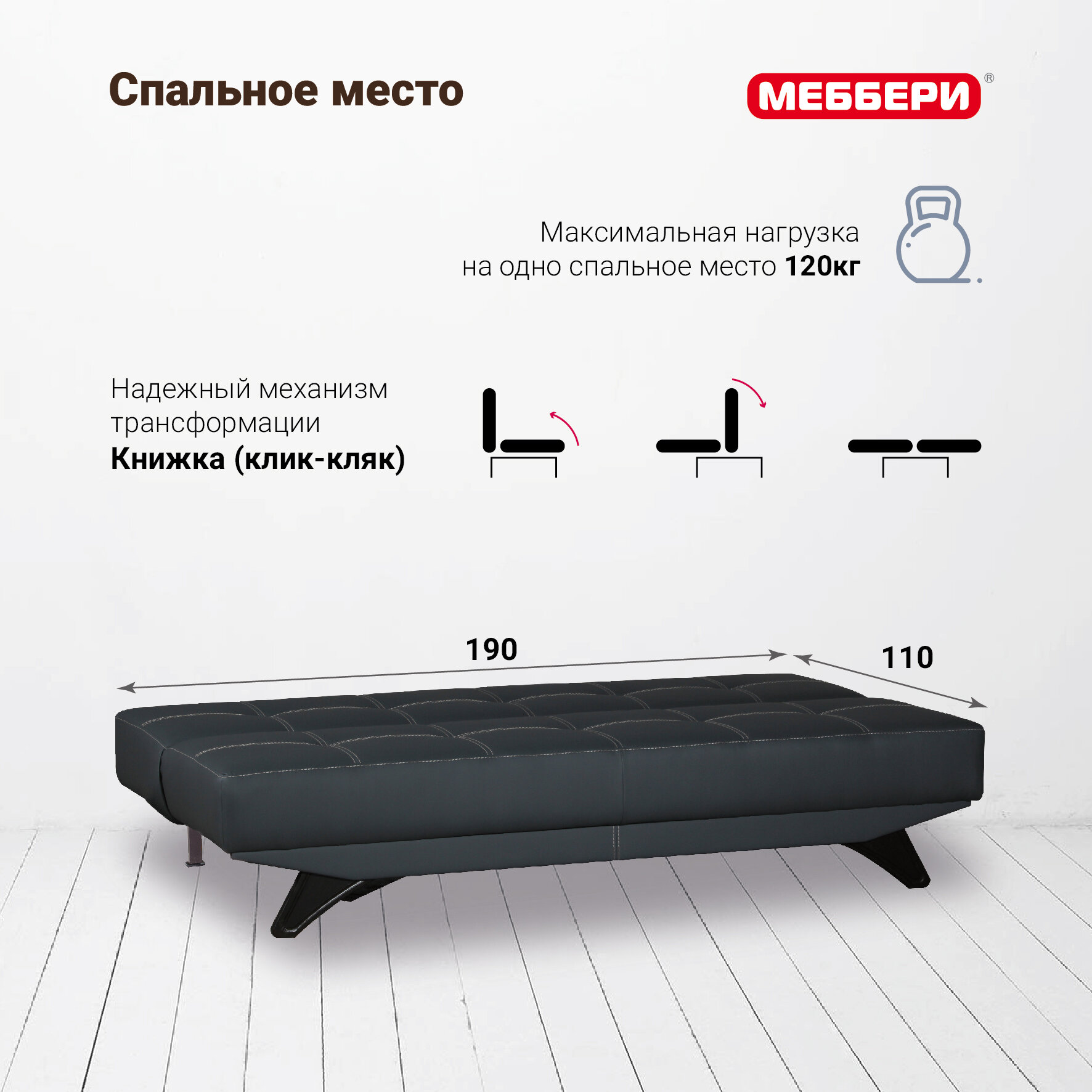 Диван-кровать Эрик на кухню, клик-кляк книжка, экокожа, на ножках, черный, раскладной диван в гостиную 22 990 ₽