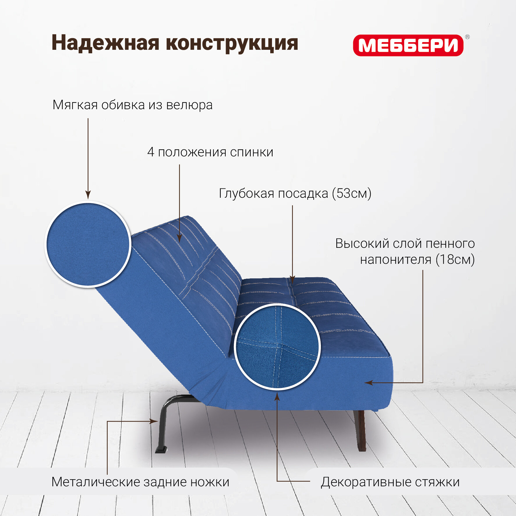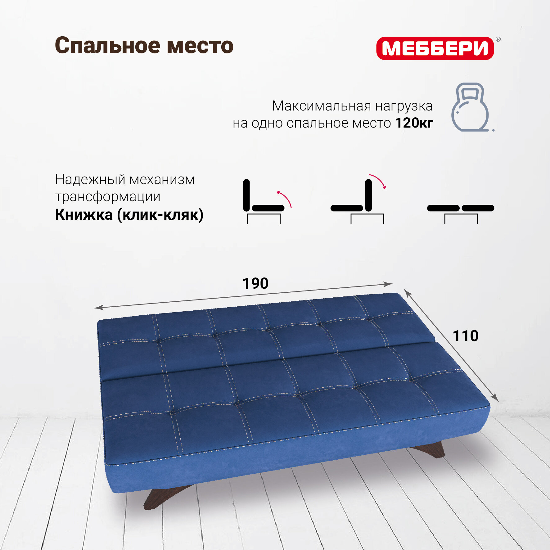 10 цен на Диван-кровать Эрик на кухню, клик-кляк книжка, микровелюр, синий, раскладной в гостиную