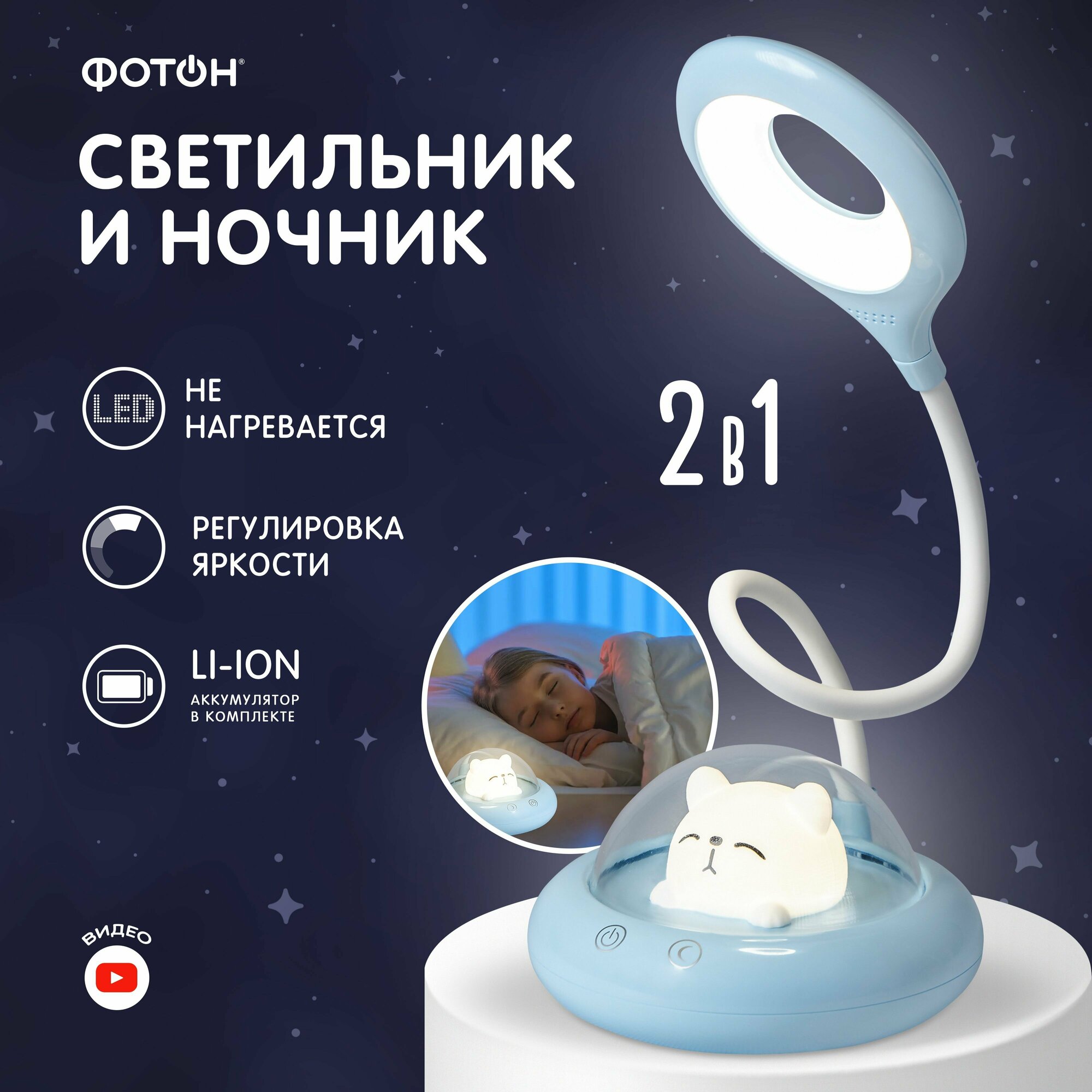 Лампа настольная, светильник ночник детский аккумуляторный фотон Космический кот, голубой 1 215 ₽