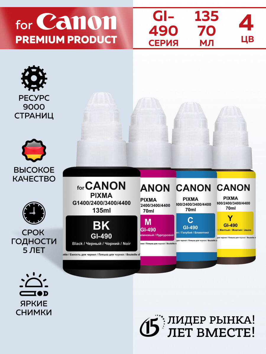 Чернила для принтера Canon G1400, G1410, G2400, G2410, G3400, G3410, G4400, G4410, G1411, G2411, G2415 G3415, G3411, G4411, GI-490, комплект