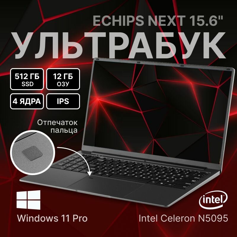 Ноутбук Echips Next 15.6", FHD IPS, Intel Celeron N5095, RAM 12 ГБ, SSD 512 ГБ, UHD-графика Intel, Windows 11 Pro информация: