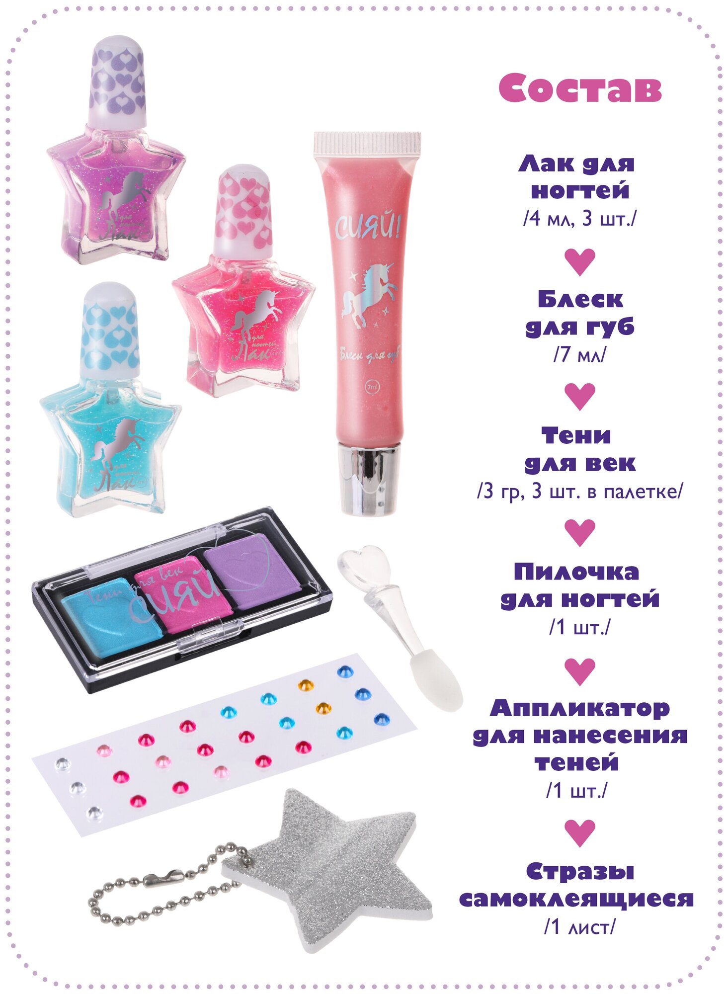 | Подробная комплектация | блеск для губ 1 шт., 7 мл, лак для ногтей 3 шт. по 4 мл, тени для век 3 шт. по 3 гр, пилочка для ногтей 1 шт, аппликатор для нанесения теней 1 шт, стразы самоклеящиеся 1 лист |