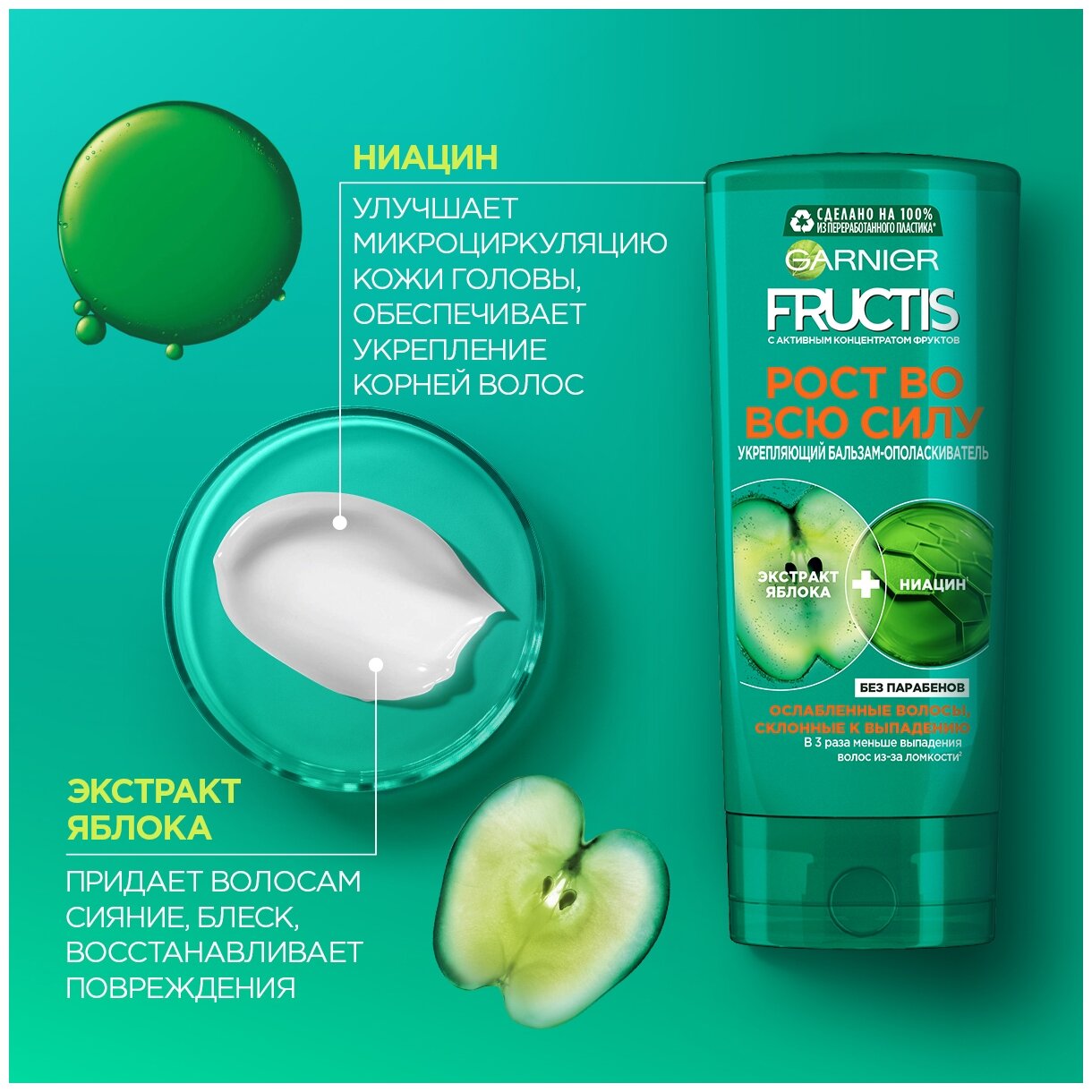 Garnier Fructis Бальзам-ополаскиватель для волос Рост во всю Силу укрепляющий для ослабленных волос, склонных к выпадению, с экстрактом яблока и ниацином, 387 мл