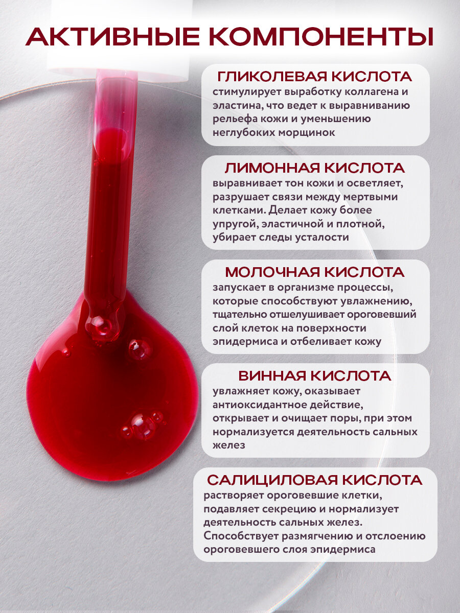 | Активный ингредиент | AHA-кислоты / гликолевая кислота / глицерин / лимонная кислота / молочная кислота / пантенол / салициловая кислота / фруктовые кислоты |