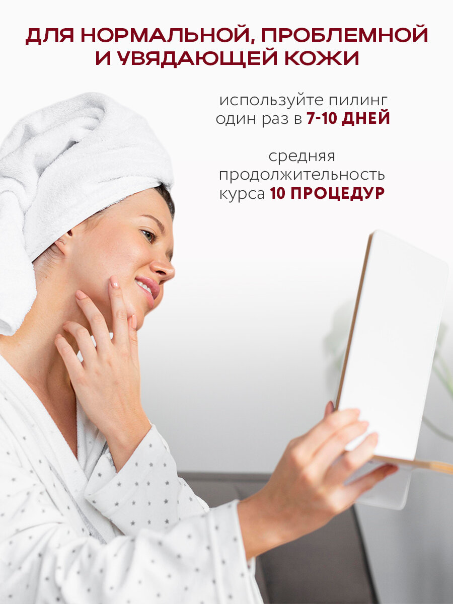 | Способ применения | Равномерно нанесите пилинг на предварительно очищенное сухое лицо, избегая области вокруг глаз и губ. Оставьте на 5-10 минут, тщательно смойте водой. Далее нанесите привычные увлажняющие средства. Используйте пилинг один раз в 7-10 дней. Средняя продолжительность курса — 10 процедур. |