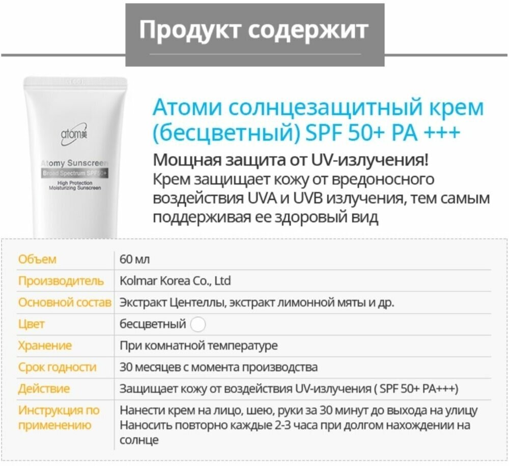 Atomy/Атоми Солнцезащитный крем UVA UVB SPF50+ увлажняющий тонирующий информация: