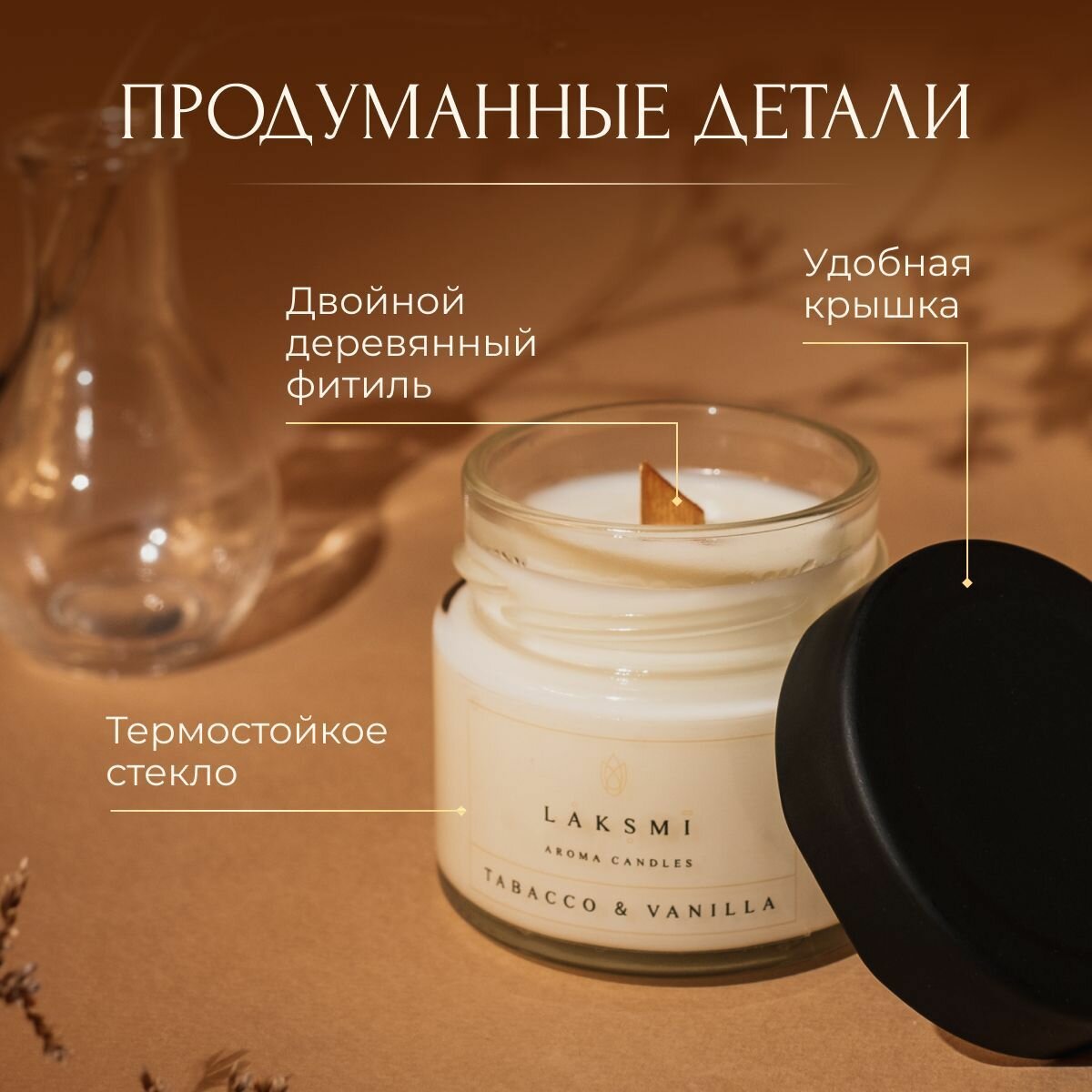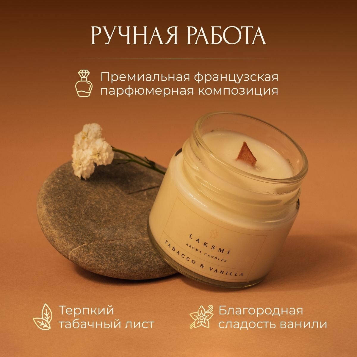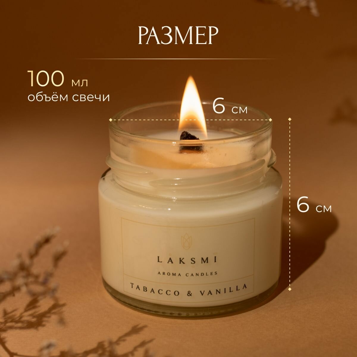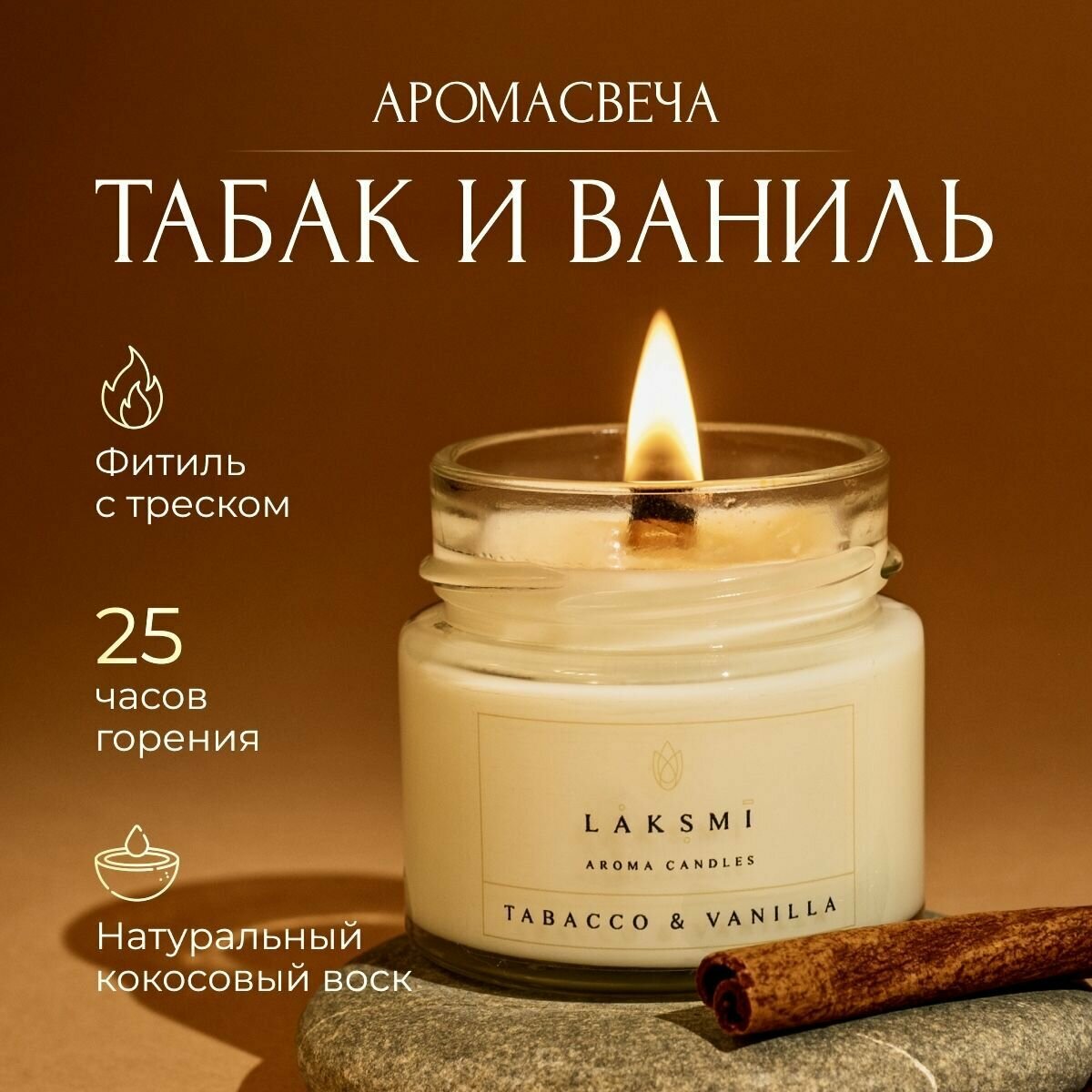 Свеча ароматическая "Табак и ваниль" Аромасвеча Laksmi/ деревянный фитиль с эффектом "потрескивания"/ 25 ч. горения, 100мл 320 ₽
