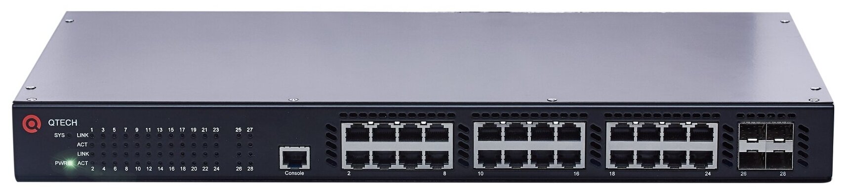 10 цен на Qtech МПТ Управляемый стекируемый коммутатор уровня L3, 24 порта 10/100/1000BASE-T, 4 порта 10GbE SFP+, 4K VLAN, 16K MAC адресов, консольный порт, встроенный БП разъем питания на задней панели, 100-24