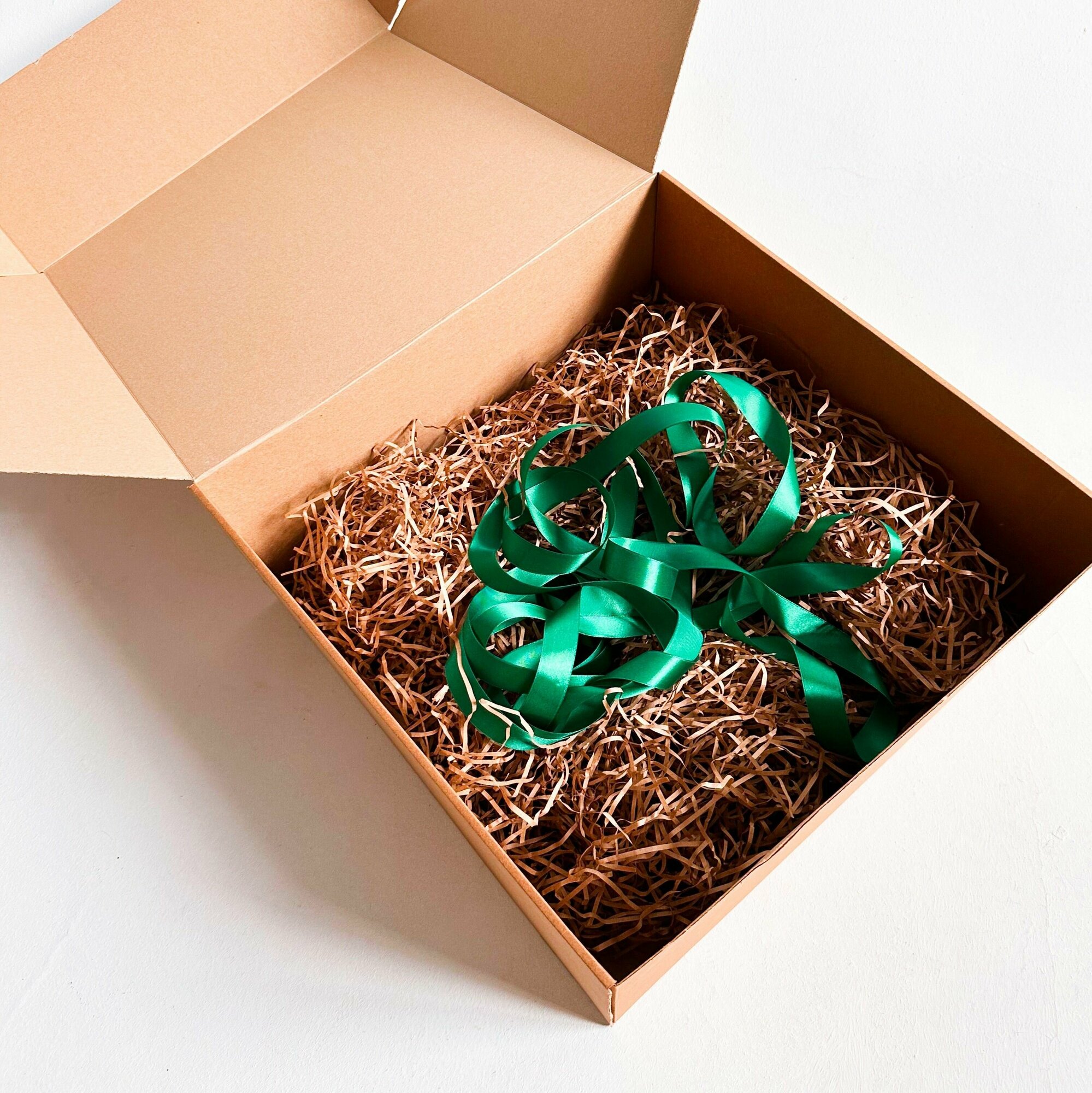Отзывы на 2 штуки - Огромная подарочная коробка GILEV 45х45х20см с зеленой лентой и наполнителем крафт