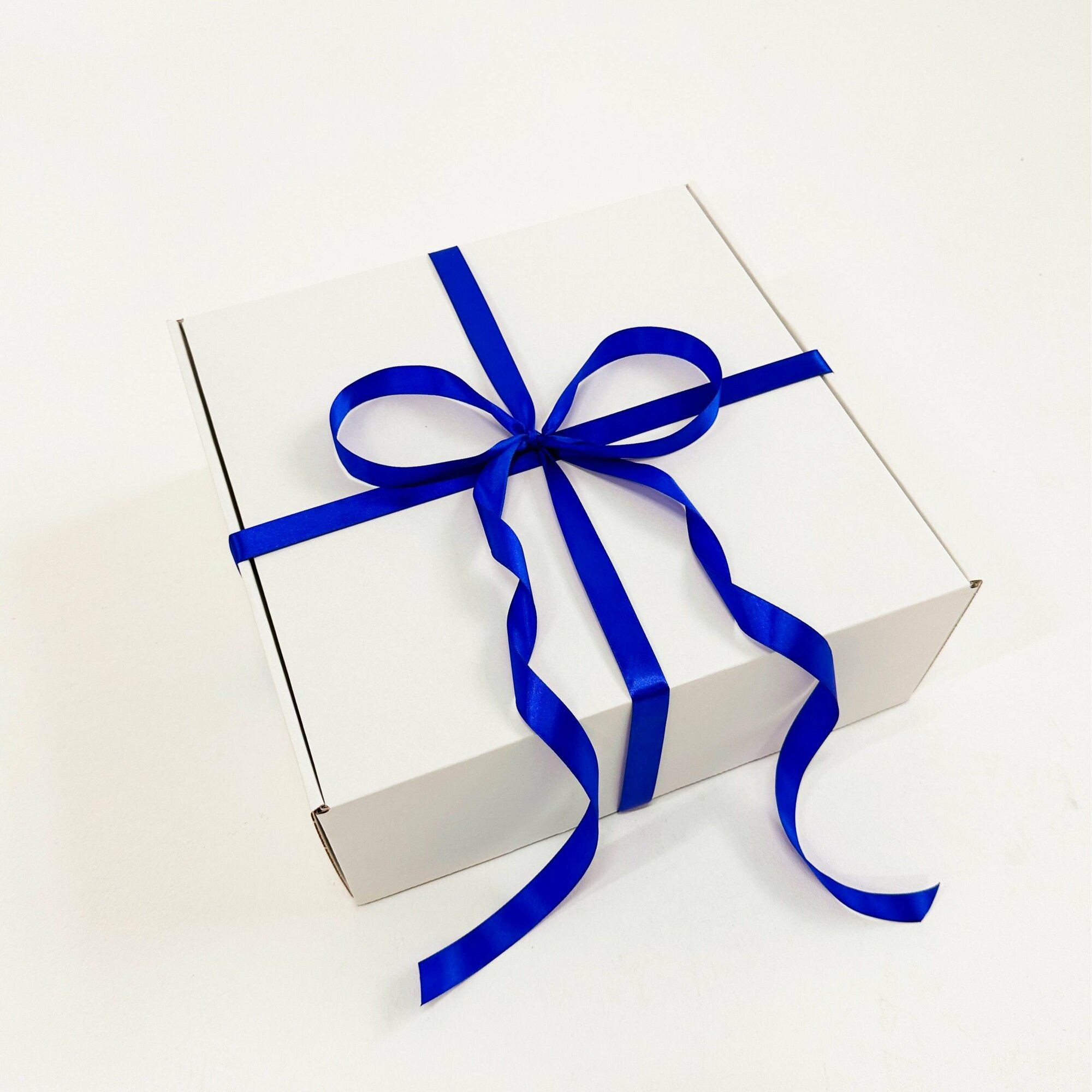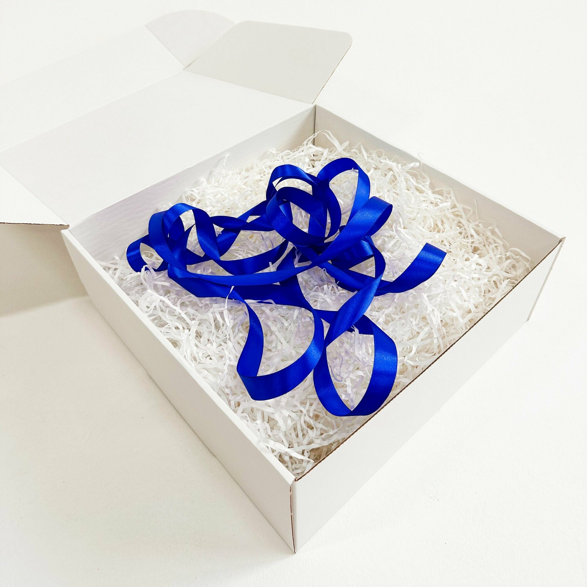 Белая подарочная коробка 32х22х10см с синей лентой и наполнителем 563 ₽